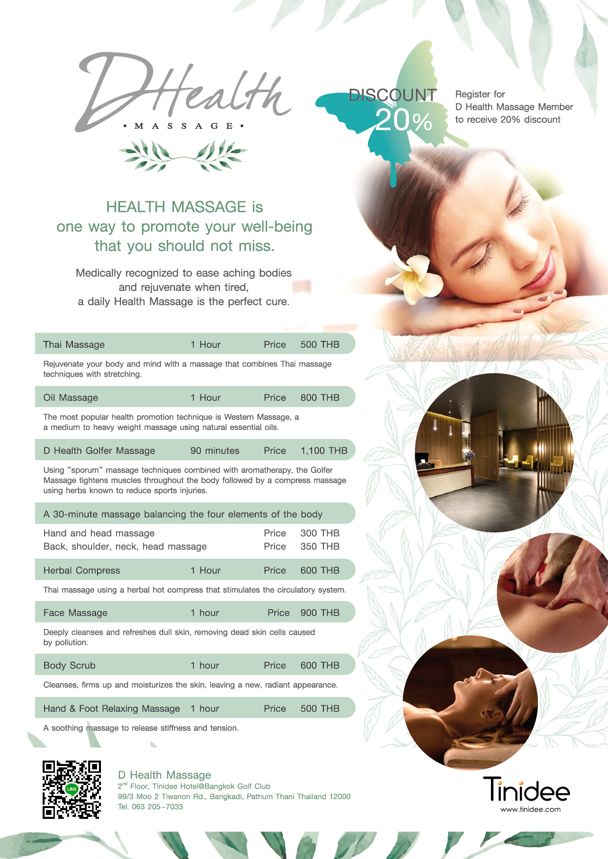 The calming ambience of our D Health Massage offers a relaxing and revitalizing selection of traditional Thai treatments, including Aroma body, Thai herbal, therapeutic massages and more. Thoughtfully designed using natural wood and stone, the warm and peaceful atmosphere is enhanced with artfully located, soothing, indirect light. Conducted in this environment of sophisticated elegance, experienced therapists will leave visitors pampered, refreshed and invigorated.